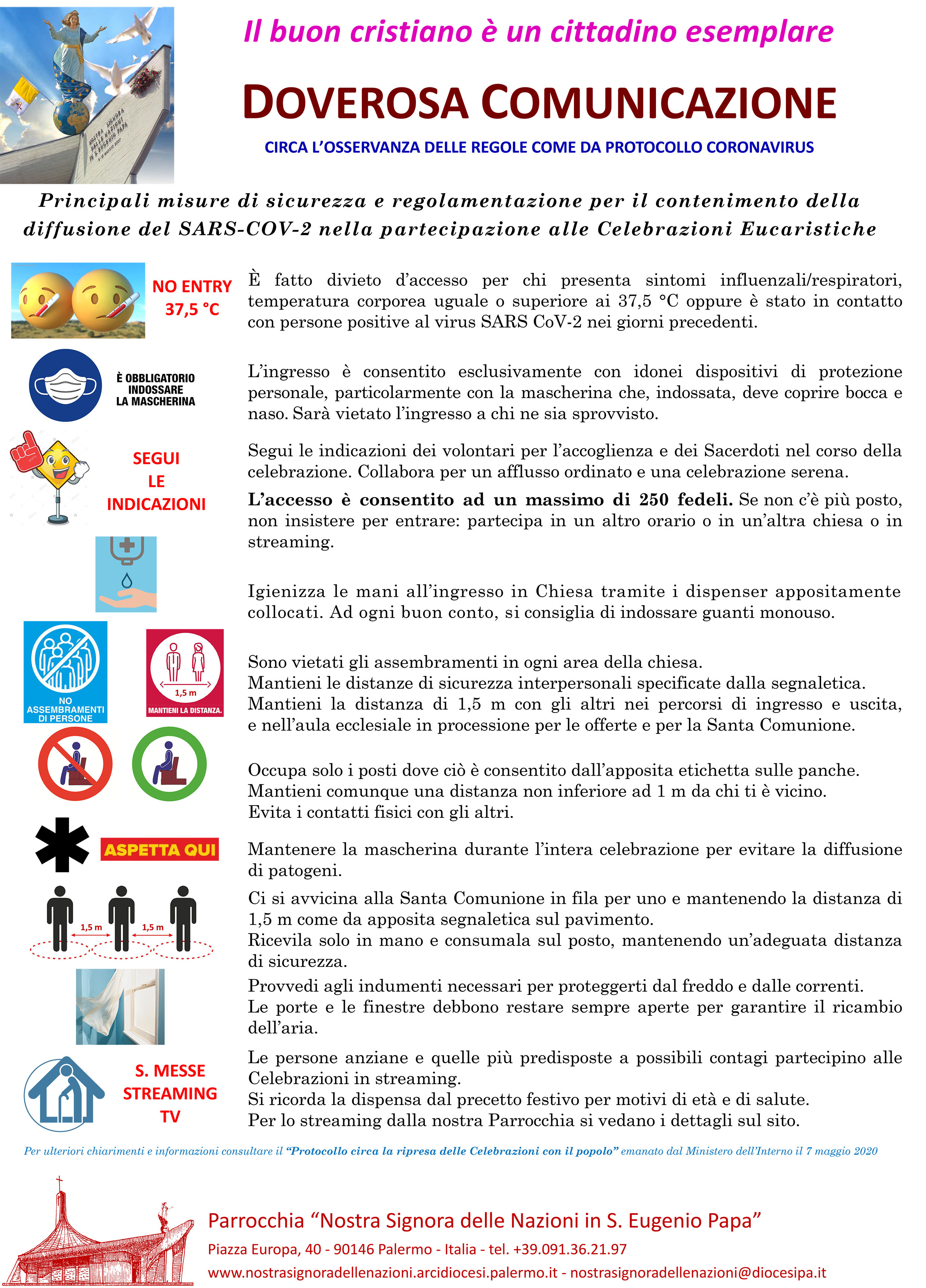 Per partecipare alle Celebrazioni è necessario seguire il Protocollo che le Autorità Governative di concerto con la Conferenza Episcopale Italiana hanno stilato. Di seguito le: